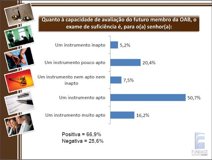 A pesquisa "Percepção de Advogados do Brasil sobre o Exame da Ordem", mostra também que 66% dos entrevistados consideram que a prova avalia a capacidade do futuro advogado.